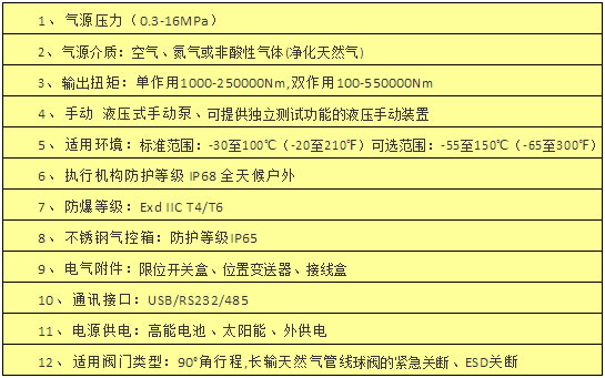 用于長(zhǎng)輸油氣管線。液壓控制系統(tǒng)與管線破管檢測(cè)系統(tǒng)結(jié)合使用,當(dāng)高、低壓力監(jiān)控、壓降速率達(dá)到設(shè)定值時(shí),破管檢測(cè)系統(tǒng)發(fā)出信號(hào)使執(zhí)行機(jī)構(gòu)關(guān)閉閥門(mén)。電動(dòng) 液壓泵和蓄能器結(jié)合使用完成了高保壓功能,可降低液壓執(zhí)行機(jī)構(gòu)對(duì)電源的要求。