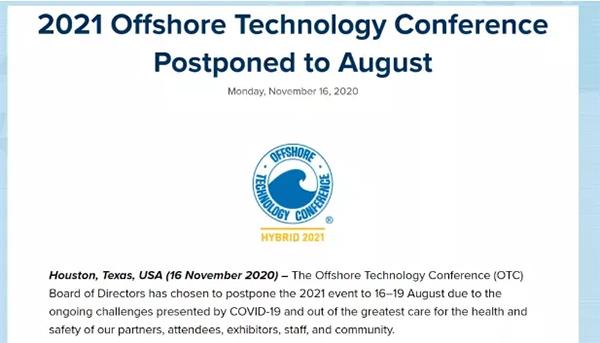 2021年美國石油展OTC推遲至21年8月,具體舉辦日期尚未確定。