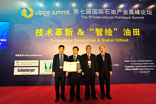 cippe石油展組委會(huì)張學(xué)山總經(jīng)理從上屆展品創(chuàng)新獎(jiǎng)得主"中國(guó)石油集團(tuán)鉆井工程技術(shù)研究院"李雪輝副總工程師手中接過獎(jiǎng)杯,并由原國(guó)家石油和化學(xué)工業(yè)局局長(zhǎng)、中國(guó)石油和化學(xué)工業(yè)聯(lián)合會(huì)會(huì)長(zhǎng) 李勇武先生頒發(fā)給本屆獲獎(jiǎng)單位“煙臺(tái)杰瑞石油服務(wù)集團(tuán)股份有限公司”葉登勝總裁