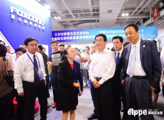 甘肅省委副書記、省長林鐸(右二),甘肅省副省長郝遠(右一)與蘭州市科技局黨組書記、局長王檸(左)參觀富士康展臺