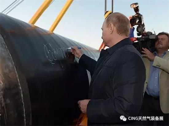 資料圖:俄總統(tǒng)普京在輸往中國的天然氣管道上題字