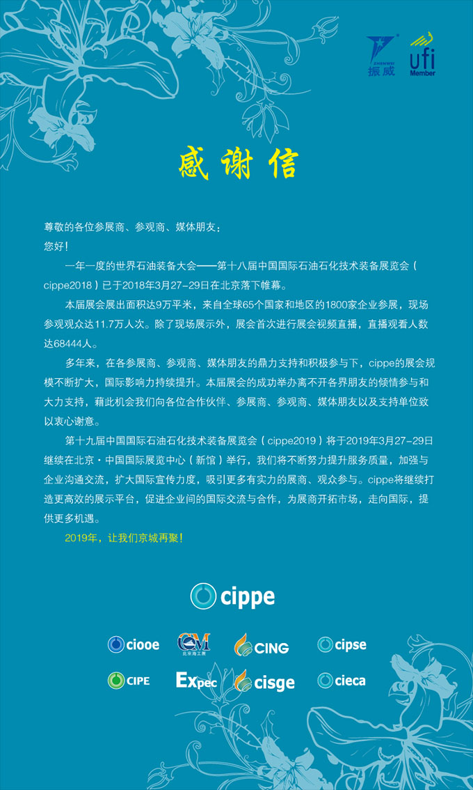 第十八屆中國(guó)國(guó)際石油石化技術(shù)裝備展覽會(huì)感謝信