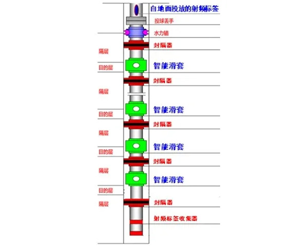HITTOP智能滑套利用無(wú)線(xiàn)射頻通信技術(shù)(RFID),以射頻標(biāo)簽為信號(hào)載體,通過(guò)地面控制系統(tǒng)寫(xiě)入目標(biāo)層段的開(kāi)關(guān)控制指令。射頻標(biāo)簽自井口投入,其經(jīng)過(guò)井下各層段智能滑套時(shí),滑套內(nèi)的無(wú)線(xiàn)模塊接收標(biāo)簽攜帶的控制指令,并執(zhí)行開(kāi)啟或關(guān)閉動(dòng)作。