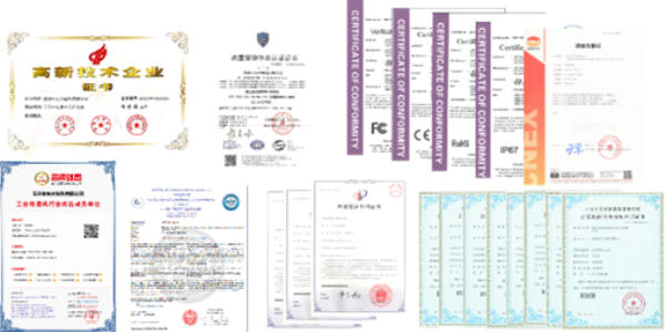 公司先后通過了ISO9001質(zhì)量管理體系、ISO14001環(huán)境管理體系和GBT28001職業(yè)健康安全管理體系,產(chǎn)品通過了CE、FCC、RoHS、A-tick、RCM、ATEX、CNEX、EMC等國內(nèi)外產(chǎn)品權(quán)威認證。